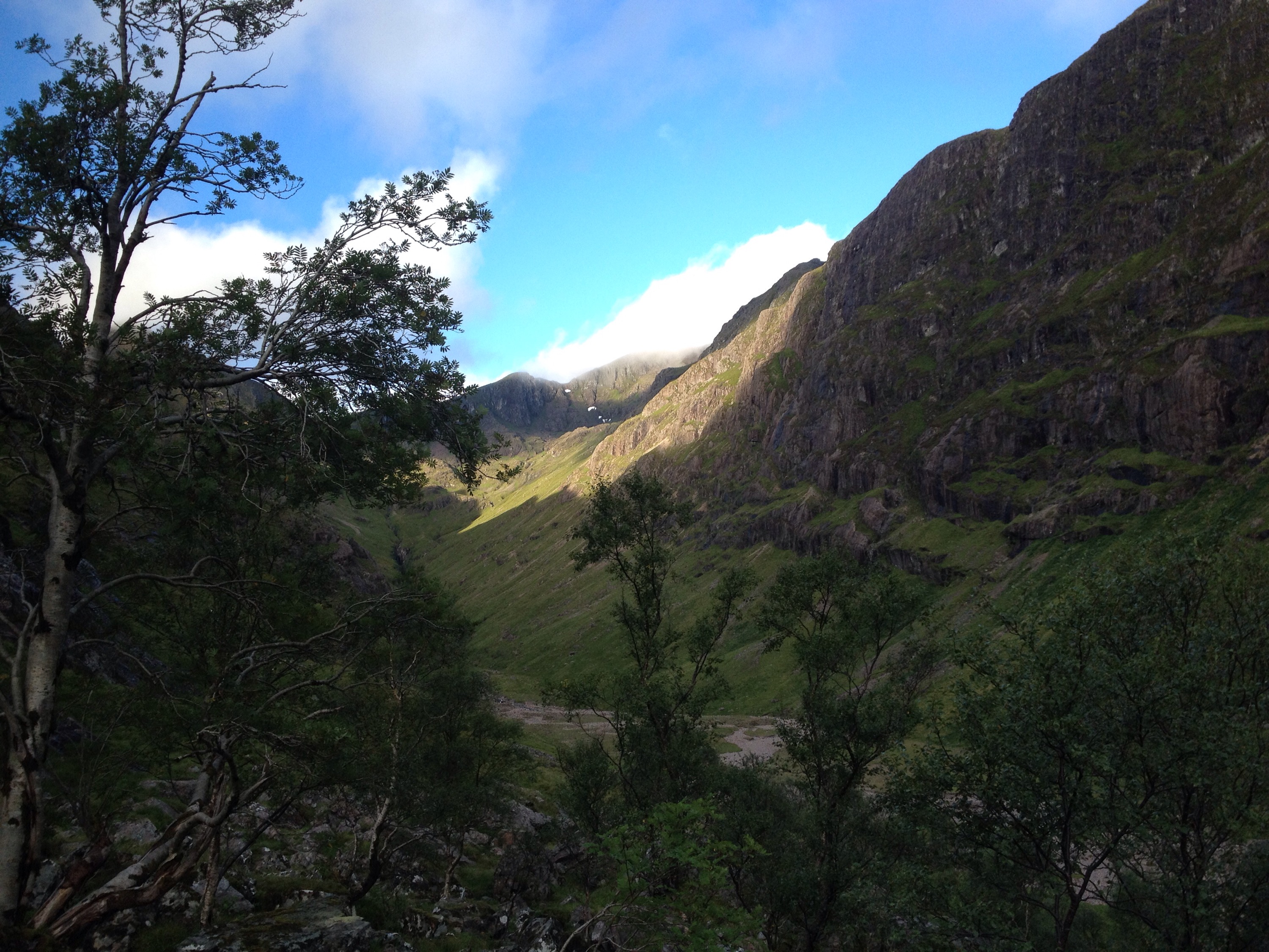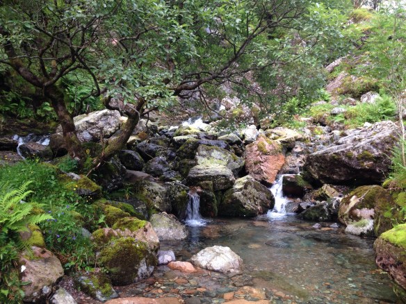 It was darker in the woodland and in my keeness to gain height, and with my eyes on the hills rather than the glen, I somehow lost the path as it crossed the river. I stayed on the right hand side of the river and gained height scrambling over moss-covered boulders, using thin birch trees for hand holds and trying not to break my leg, be stranded for the night and not discovered until husband raised the alarm when I didn’t return home the next evening.
