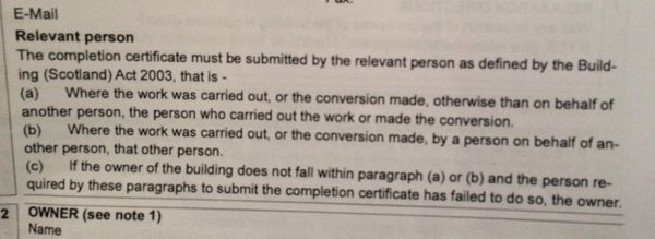 But before I spend any more money I need to claim back my VAT and before I can claim back my VAT I need a building warrant. And for the building warrant I need an EPC (done!!!) a Form Q (see below) and all sorts of stuff to be sorted. I ask Stephen when I should arrange the final visit from building control.