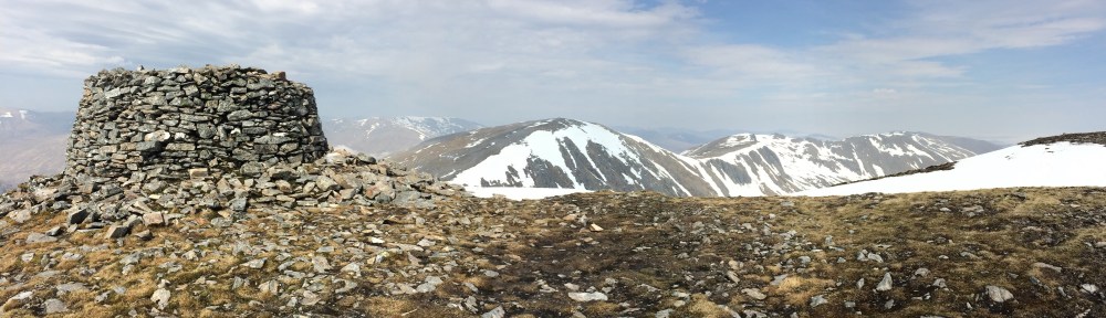 We reached Mam Sodhail and sat down by the an extremely well constructed and enormous cairn for a snack, not expecting to see anyone. But a couple were just approaching from the other side. I hastily put my top back on, and then my knee started to hurt.